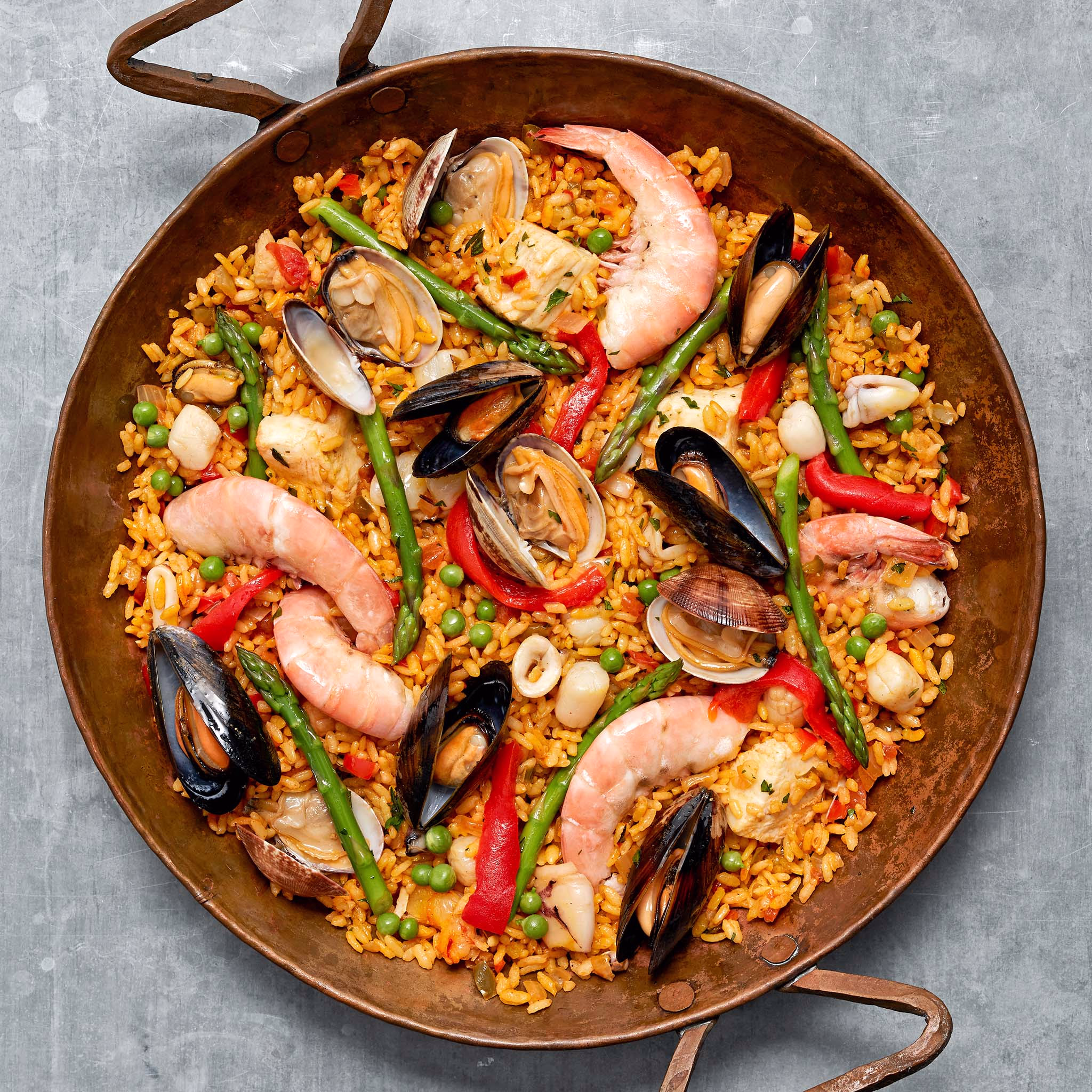 Garnish the Paella with peas, asparagus spears and red pimentos; cover with foil to keep warm until ready to serve.