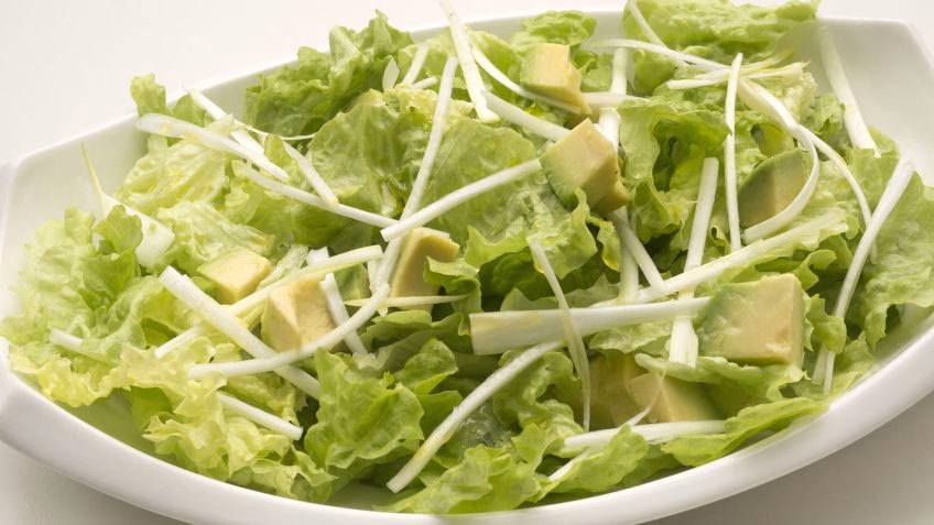 Tear the lettuce into pieces and place in a large salad bowl. Arrange the avocado slices on top and then garnish with slices of onion on top. To make the dressing, use a blender and add the olive oil, vinegar, lime juice, salt and pepper. Blend the contents well. Then pour over the salad. Enjoy!