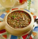 This hearty soup can be served as a main dish, thick with chick-peas and accented with spanish sausages.